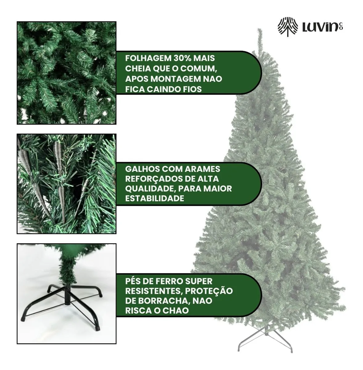 💚 Cor verde natural: reproduz com fidelidade o tom dos pinheiros verdadeiros.